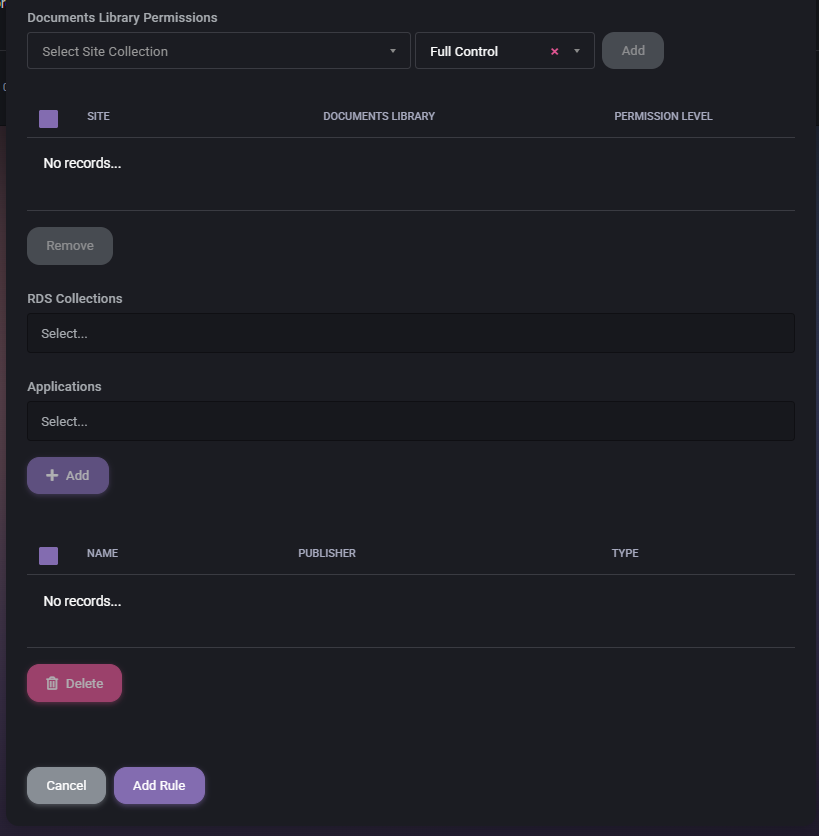 - Validate document library permissions carefully before adding them to a rule, especially when high-access levels such as Full Control are involved.