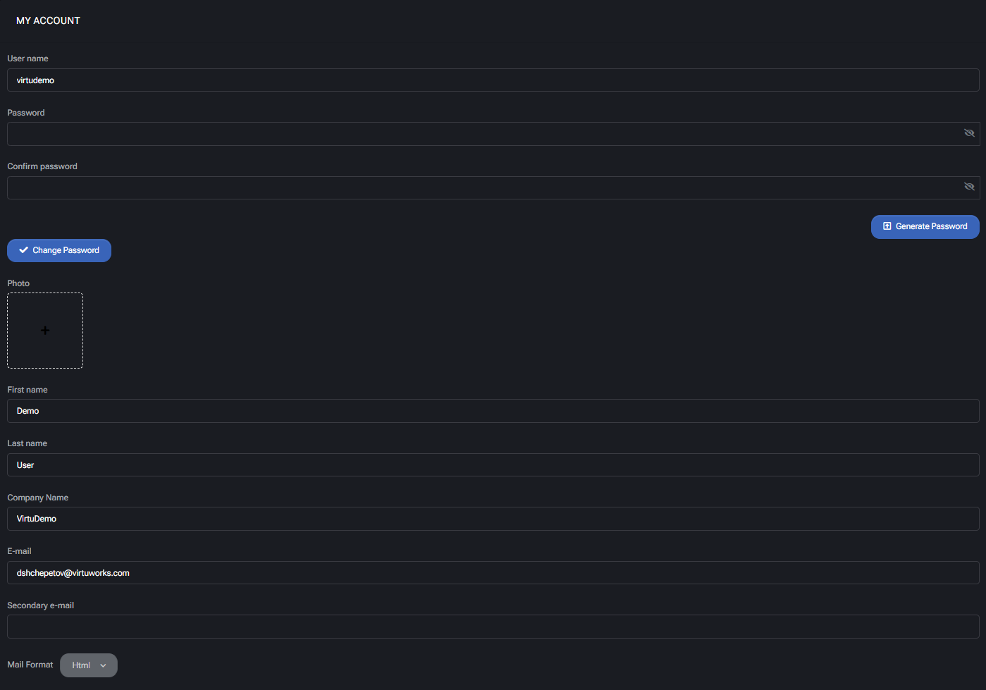 - Photo — Upload or replace the user’s profile picture displayed across the interface.
