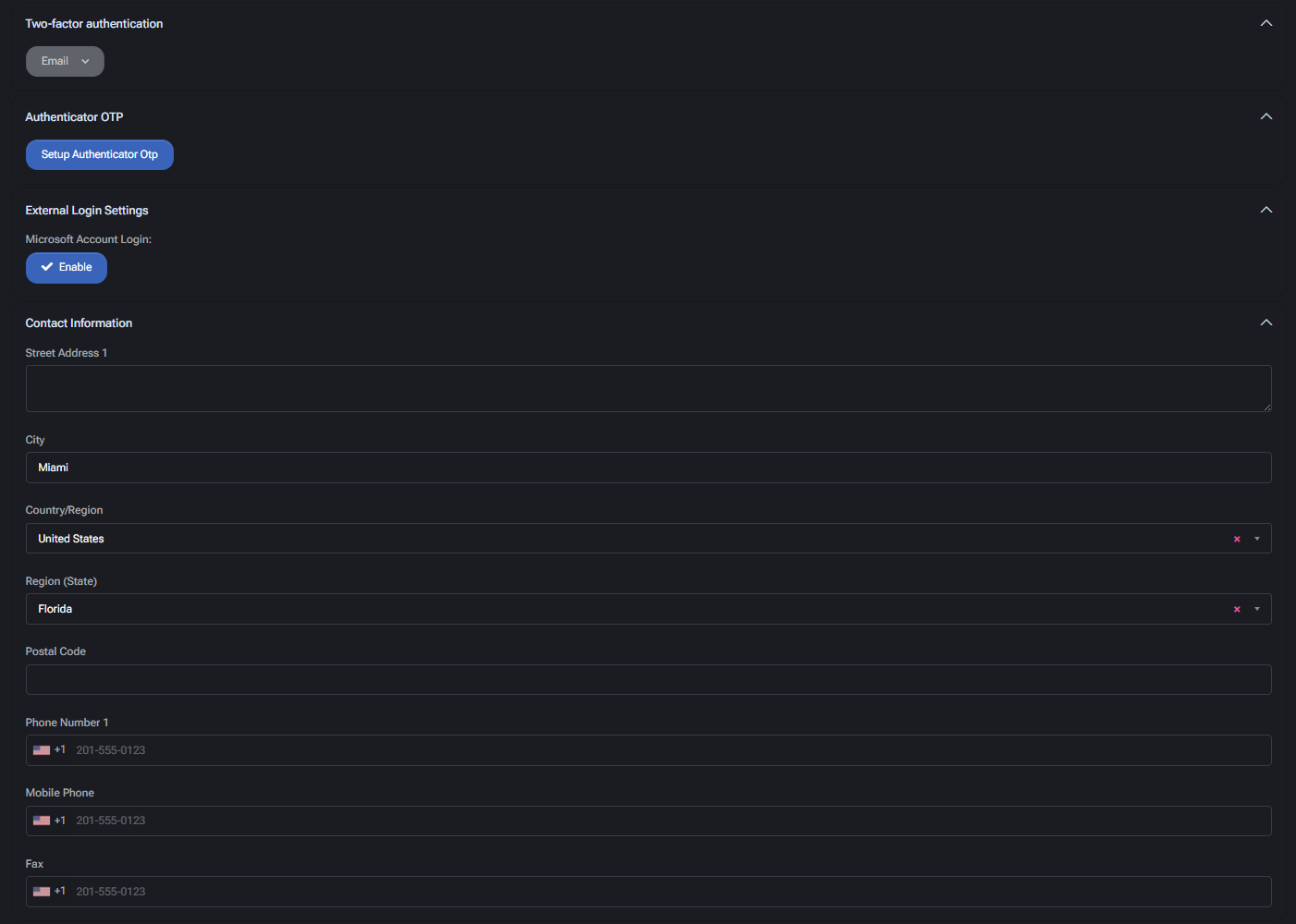 - Mobile Phone — Secondary number for SMS notifications or two-factor authentication.